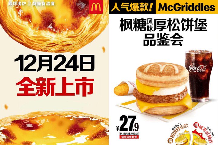 麦当劳将于本月下旬连续推出两款早餐新品,分别为「枫糖风味厚松饼堡」与「即烤出炉蛋挞」,进一步扩展其「麦满分系列」产品线。