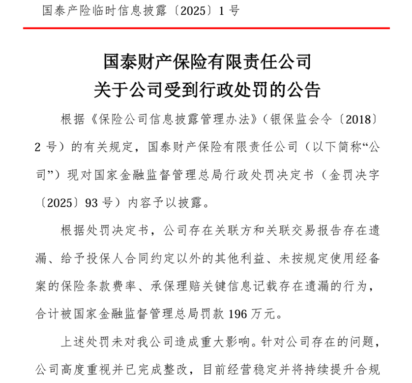 6月6日,国泰产险通过官网发布了一则公司受到行政处罚的公告,对国家金融监督管理总局行政处罚决定书内容予以披露。根据处罚决定书,公司存在关联方和关联交易报告存在遗漏、给予投保人合同约定以外的其他利益、未按规定使用经备案的保险条款费率、承保理赔关键信息记载存在遗漏的行为,合计被国家金融监督管理总局罚款196万元。