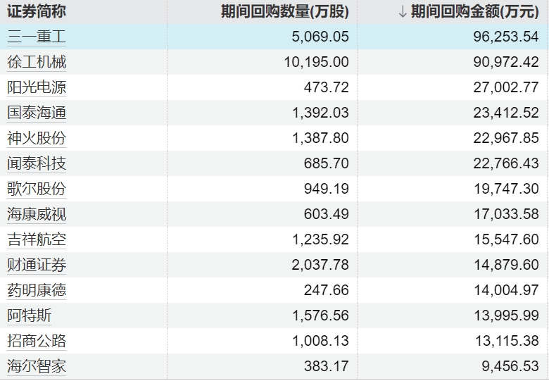 163家上市公司股票获回购,三一重工回购金额最高163家上市公司股票获回购,三一重工回购金额最高